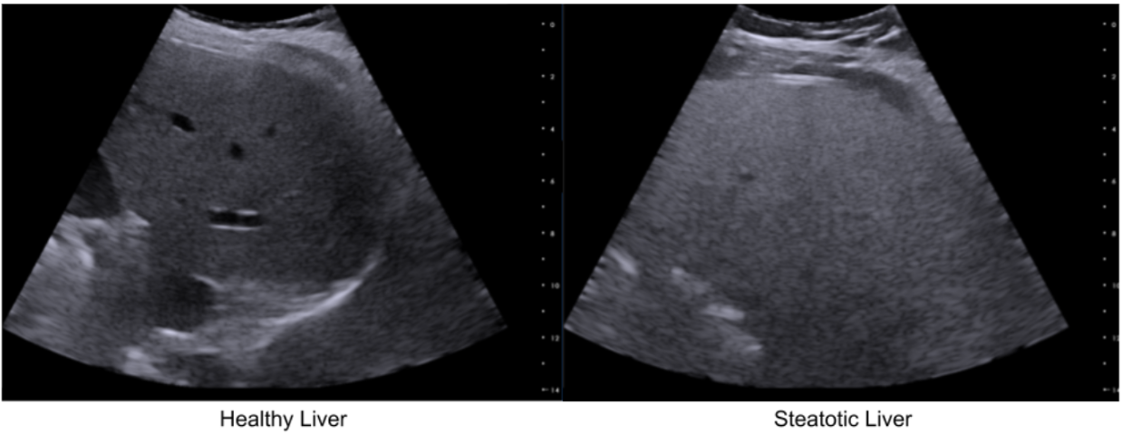 Increased intracellular fat elevates the backscattering coefficient (BSC), making the liver appear brighter (“bright liver”). Fat also causes higher attenuation (ATT), i.e. signal loss and posterior shadowing, and decreases the speed of sound (SOS) as lipid (fat) medium is a slower medium than healthy (aqueous) liver tissues.